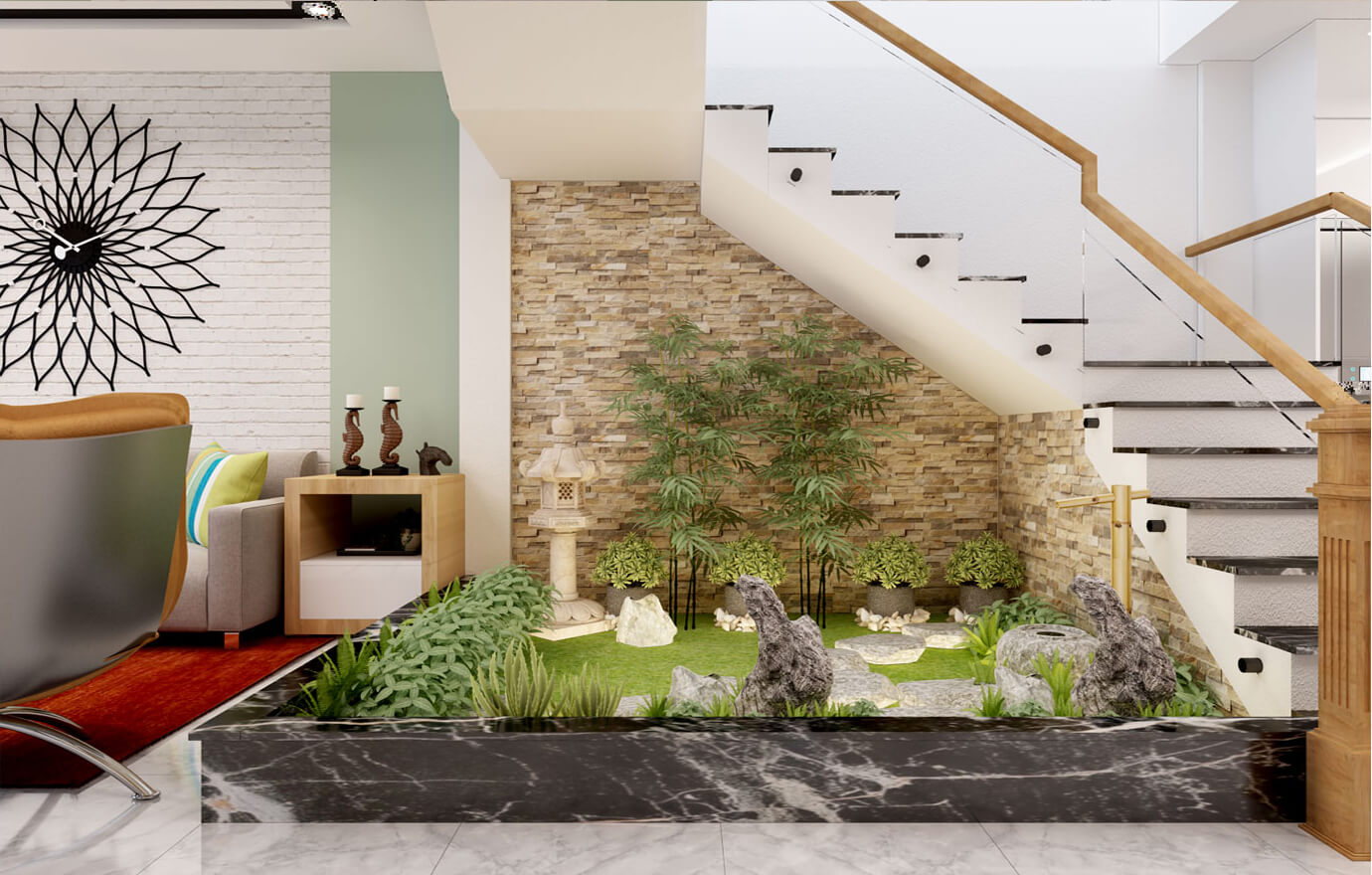 Yếu tố Kim: Gia chủ có yếu tố Kim thường có tính chuyên môn, tập trung và quyết đoán. Trong thiết kế hòn non bộ, sử dụng các đá có màu trắng hoặc bạc, kết hợp với các chi tiết kim loại như thép không gỉ hoặc nhôm.